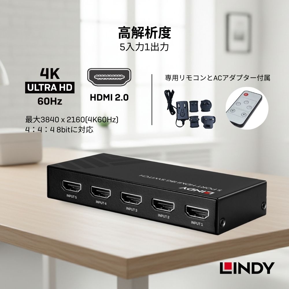 5台の HDMI オーディオビデオの入力デバイスを接続し、出力をHDMI モニターに接続します