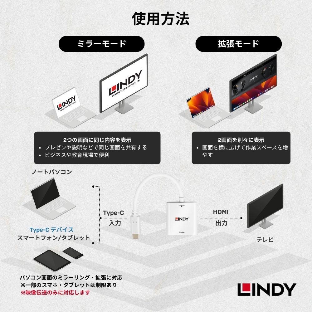 • パソコン画面のミラーリング / 拡張機能を対応可能(一部のスマホ及びタブレットにはミラーリング機能のみ対応)