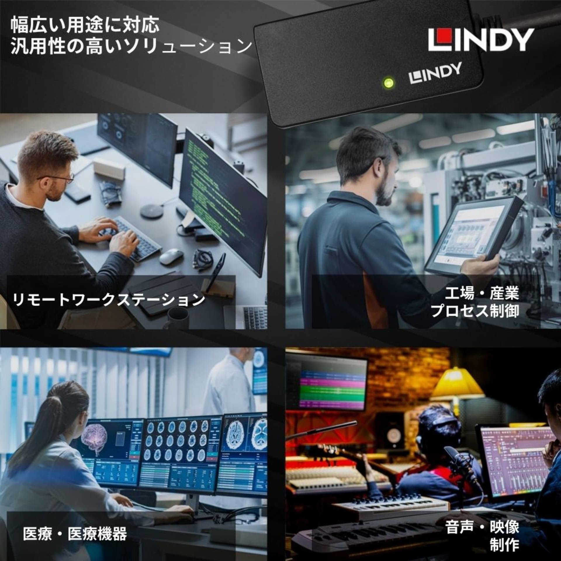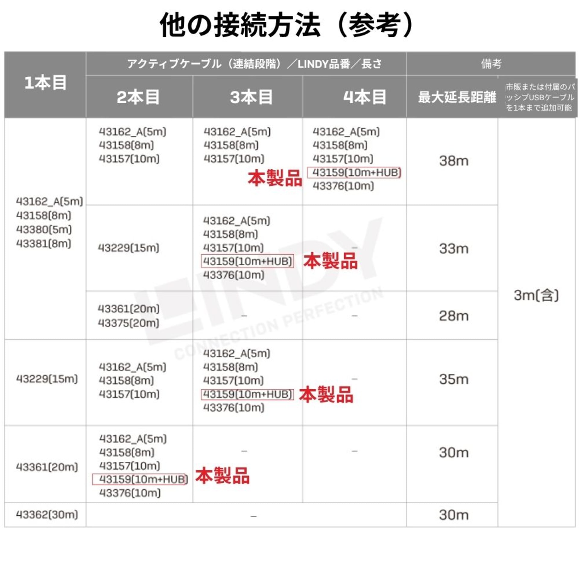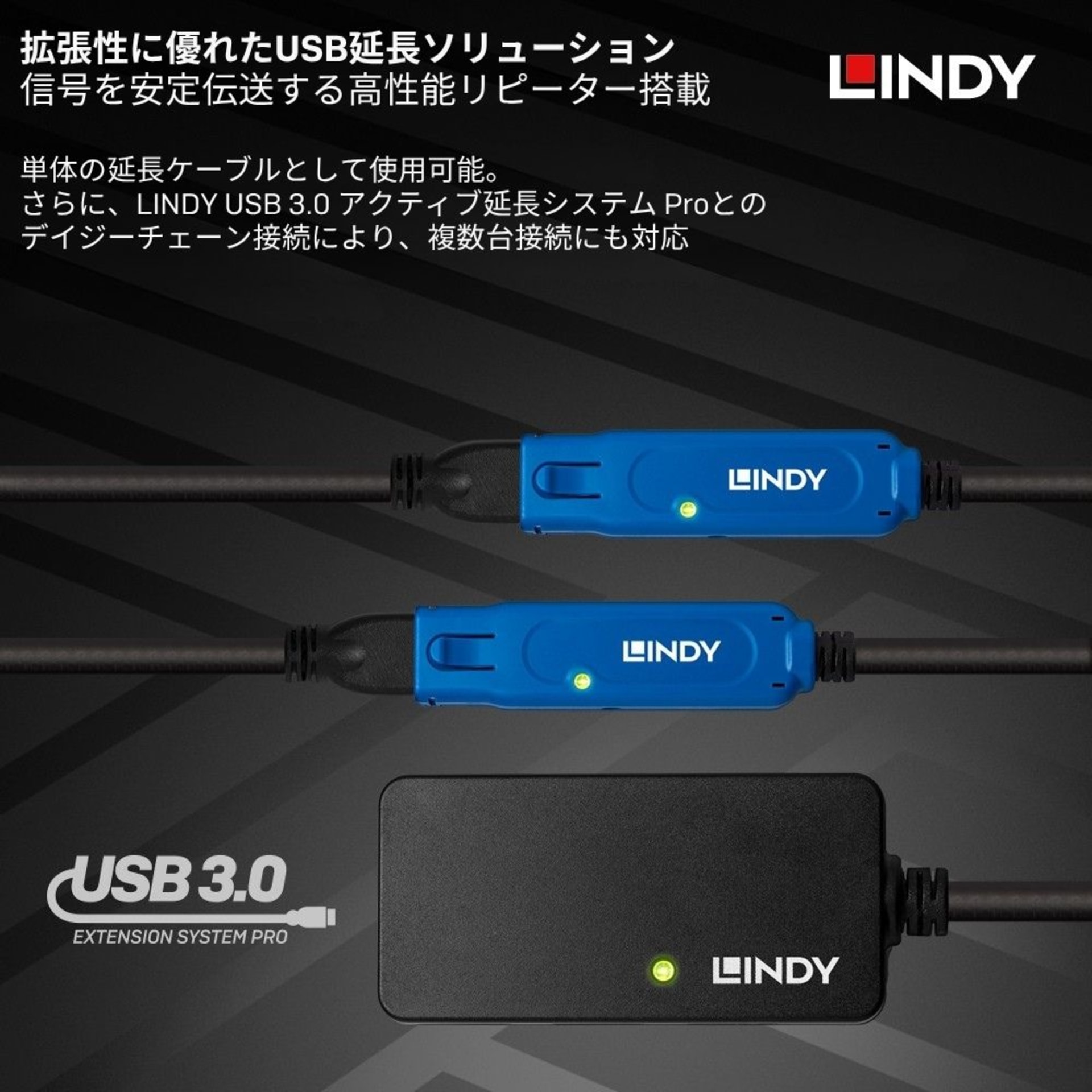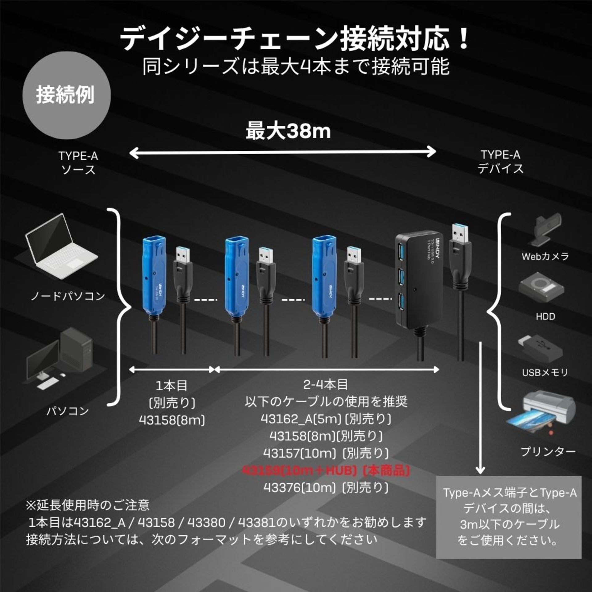 同シリーズ製品をデイジーチェーン接続することで、最大38mまで延長可能