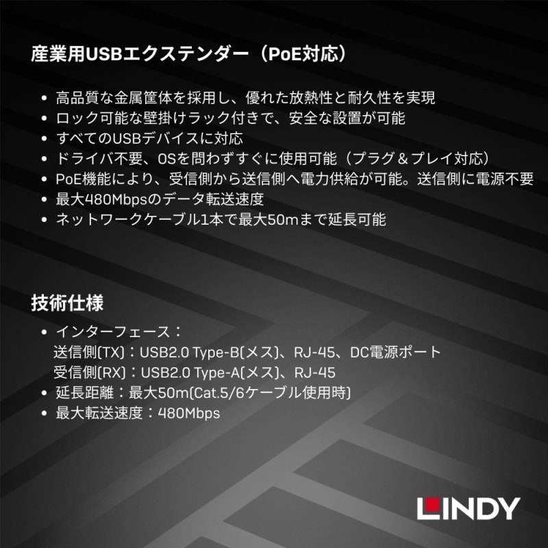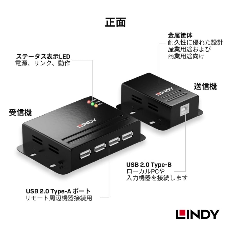 送信側(TX):USB 2.0 Type-B メス / RJ45コネクタ / DC電源ジャック